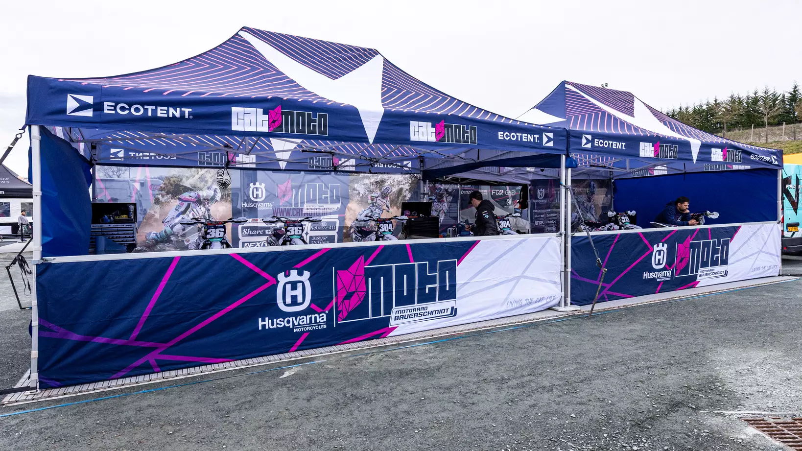 Für ihr Rennteam war eines klar: Der Auftritt im Fahrerlager sollte genauso stark sein wie die Performance auf der Strecke. Mit zwei Ecotent Faltpavillons in individueller Gestaltung, hat Cat Moto seine Boxenfläche auf ein neues Level gebracht.