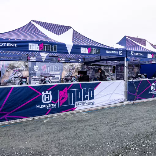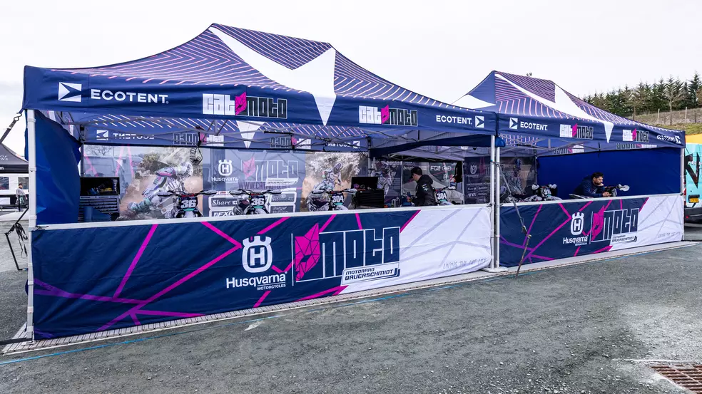 Neben der auffälligen Bedruckung mit Teamlogos sorgt das Setup dank Seitenteilen, Regenrinnen, Frontbannern und Gewichten nicht nur für Sichtbarkeit, sondern auch für den nötigen Schutz vor Wind und Wetter: "We wanted a professional look and a reliable structure to protect our riders and bikes. Ecotent gave us both".